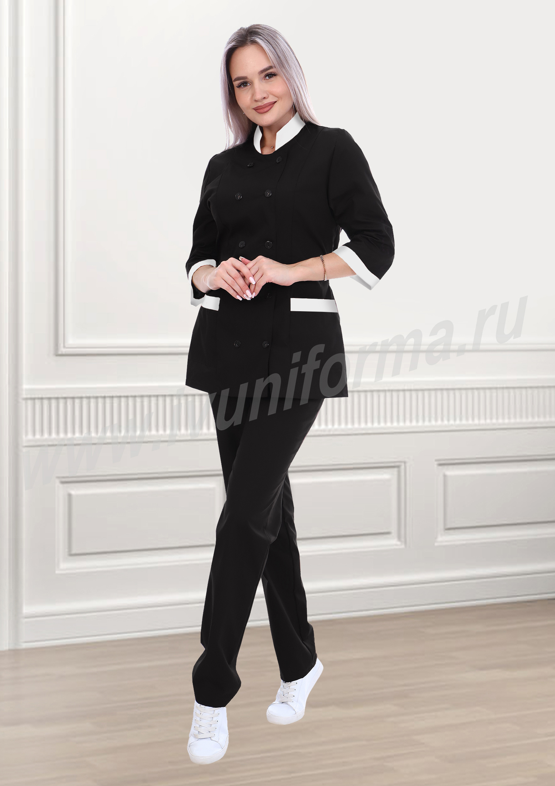 Костюм повара женский состоит из куртки и брюк. Куртка прямого покроя с центральной двубортной застёжкой на пуговицы. Воротник-стойка, срезы карманов. Брюки прямые, по линии талии стянуты эластичной лентой. Костюм повара предназначен для работников пищевой промышленности.